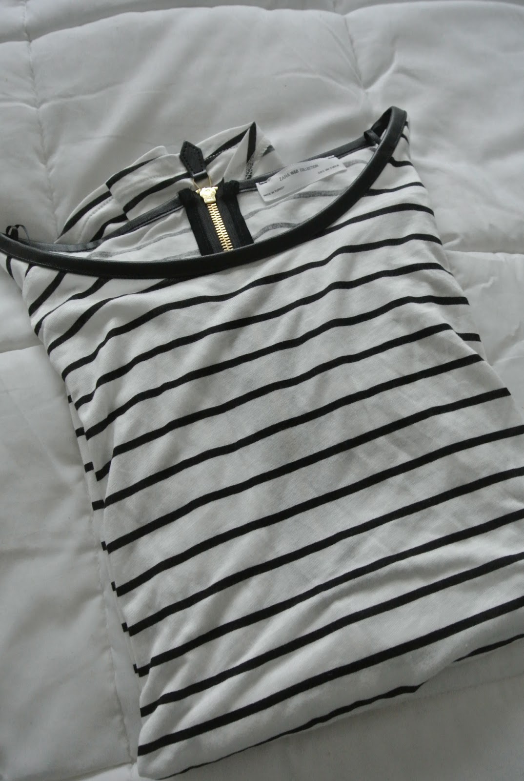Tätä t-paitaa ihastelin jo jokin aika sitten Zarassa, mutta kokoani ei silloin ollut. Nyt viikolla piipahtaessani uudelleen heillä tilanne oli onnekseni muuttunut! ;) Paita on mukavan löysä, niin imetyskin varmasti onnistuu. Rakastan tuota nahkaista yksityiskohtaa!!